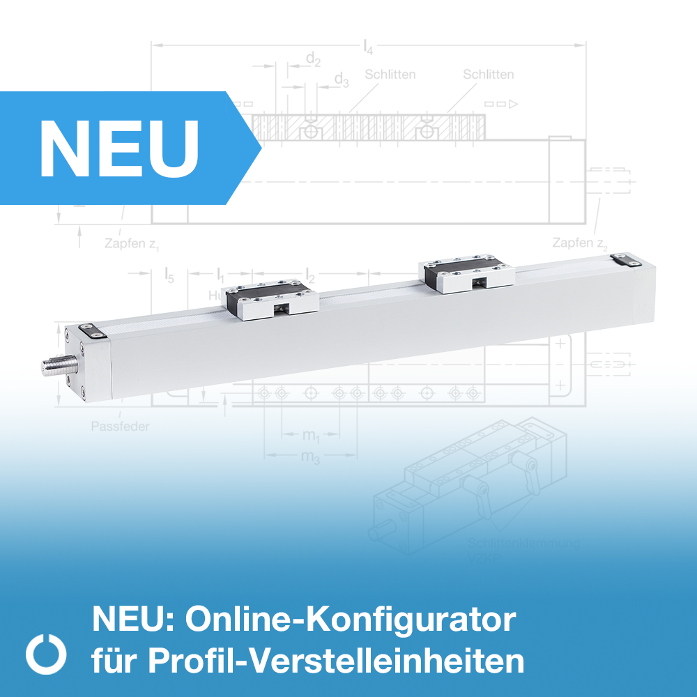 Der neue Online-Konfigurator erleichtert die Konfiguration Ihrer individuellen Profil-Verstelleinheiten VP1S und VP2S erheblich und gibt einen umfassenden Überblick über die verschiedenen Ausführungen und mögliches Zubehör - individuell auf Ihre Anforderungen abgestimmt, intuitiv in der Bedienung und effizient im Ergebnis. So finden Sie mit wenigen Klicks genau die Lösung, die zu Ihrem Projekt passt.
