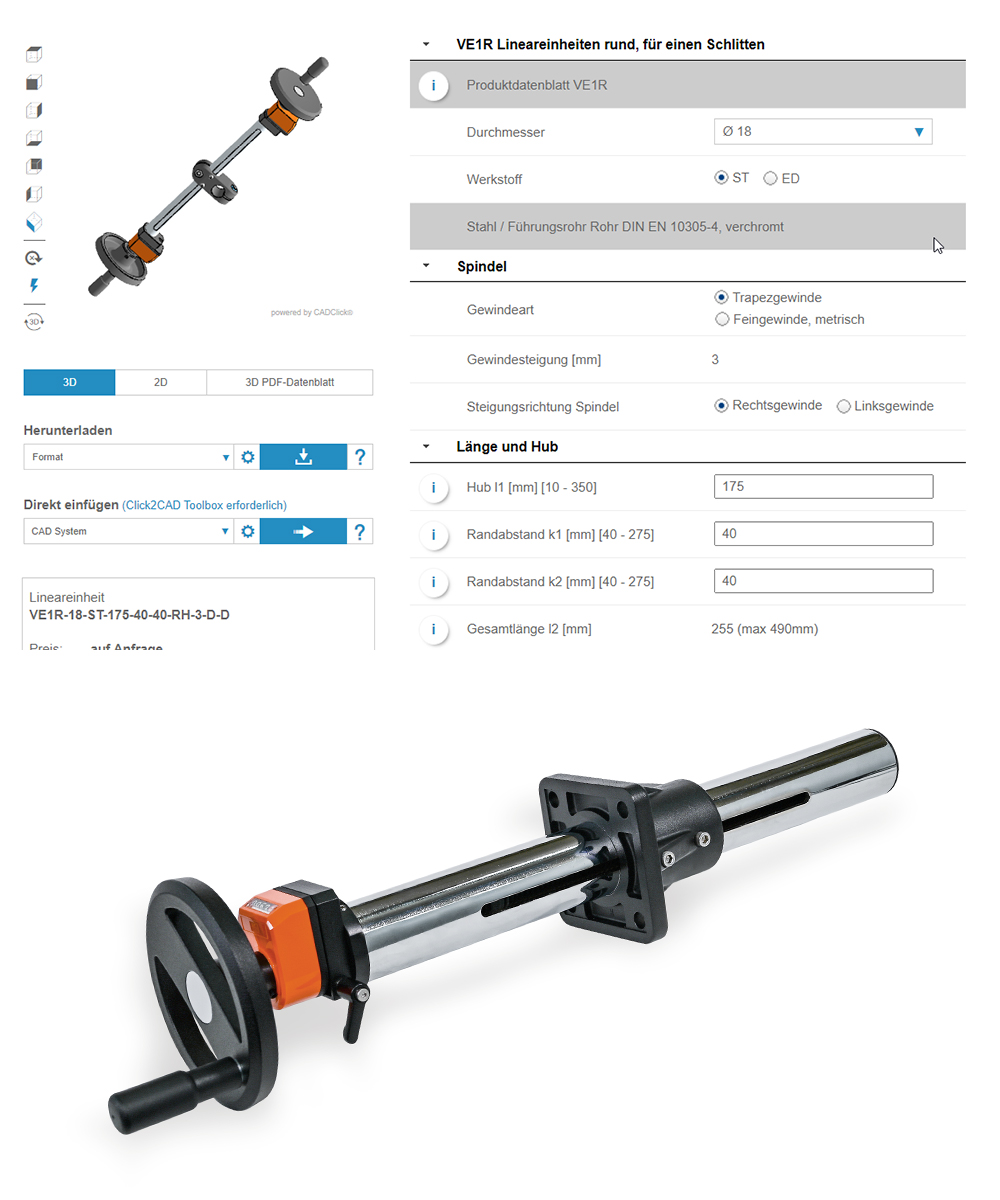 Verstelleinheiten verfügen über zahlreiche Konfigurationsmöglichkeiten, die für unterschiedlichste Anwendungsfälle angepasst werden können. Um diese Individualisierungs-Optionen übersichtlich darzustellen, bedarf es ein bedienungsfreundliches Konzept. Möglich macht das der neue Online-Konfigurator, über den sich die zentralen Parameter einer Einrohr-Verstelleinheit spezifizieren und in Echtzeit ausgeben lassen.