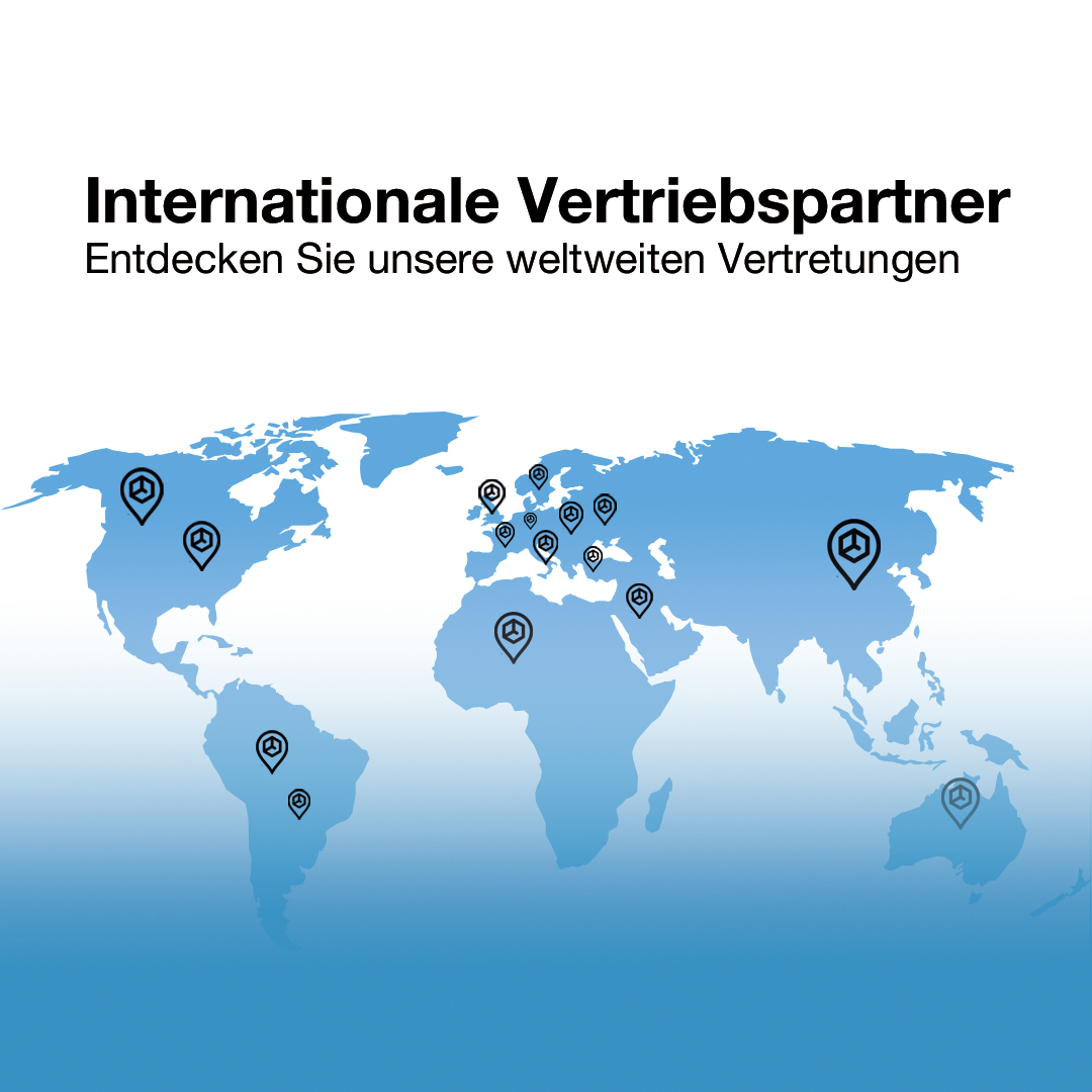 Unser internationales Netzwerk aus erfahrenen Vertriebspartnern ermöglicht es uns, Kunden auf der ganzen Welt zuverlässig und kompetent zu betreuen.