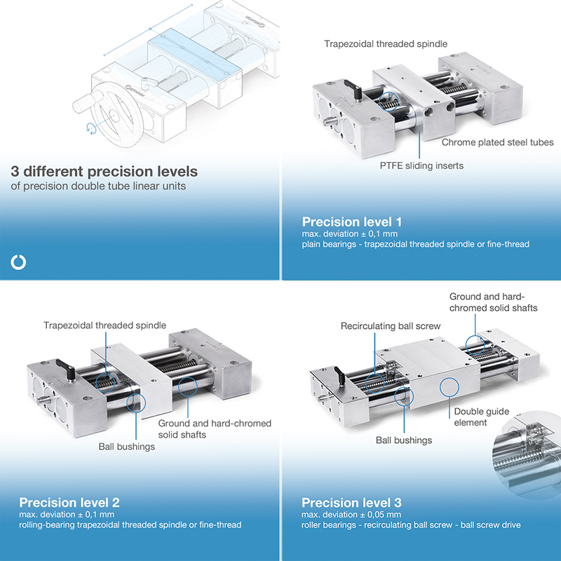 In many applications, precision determines efficiency, quality, and process reliability. That is why we offer our double tube linear units in three precision levels, perfectly tailored to the specific application: